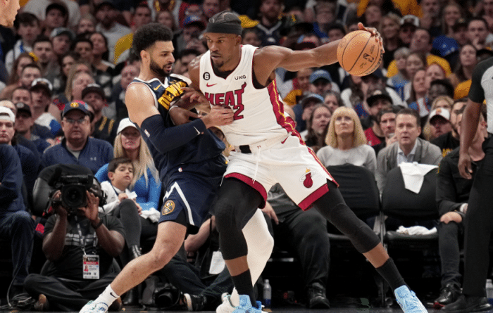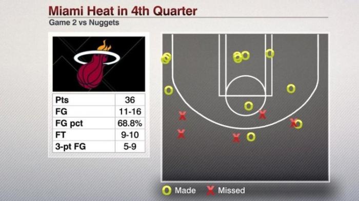 总决赛G2一战,热火第一节一度领先11分,斯特鲁斯首节命中4记三分立功,不过热火调整阵容后约基奇带队缩小分差,热火首节26-23仅领先3分;第二节,热火进攻停滞,被掘金打出21-6攻势,并且一度落后15分,不过热火继续顽强抵抗,半场打完仅落后6分。