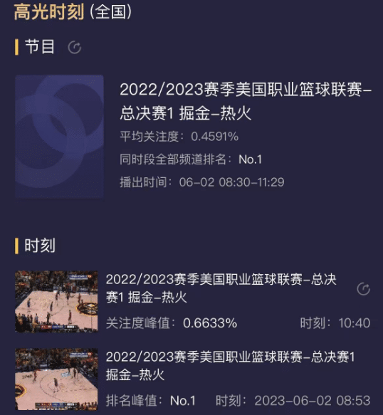 这场总决赛G1的收视率虽然位居同时间段的全国第一,但相比起此前的东决、西决甚至是分区半决赛,收视率都有明显下滑。从这点就可以看出,大家对于今年总决赛的关注度是有下降的,其中最为重要的一个原因就是两队差距太大,掘金几乎各个方面都要比热火强。