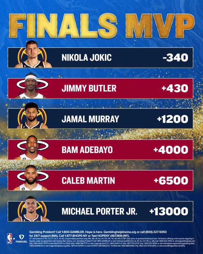178直播讯06月01日,NBA最新总决赛MVP赔率出炉,约基奇位居榜首并且大幅度领先,巴特勒第二,热火东决抢七晋级的大功臣马丁上榜。