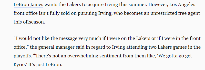 “他们(湖人队)没有表现出对欧文的强烈兴趣,就好比‘我们得去得到他。’只是詹姆斯想要欧文。