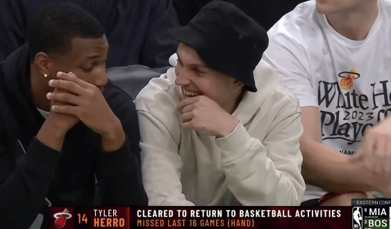 热火的希罗在场边笑得很开心,他在季后赛首轮就骨折,如今总决赛来袭,他很有可能会复出。