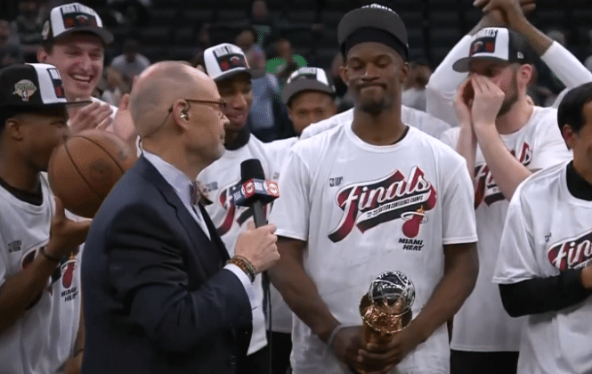 值得一提的是科雷布-马丁看到巴特勒获得东决MVP的表情,非常有意思,在赛后MVP投票中,巴特勒5票,马丁4票,惜败给队友。