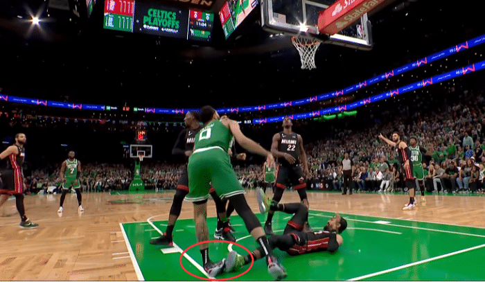 绿军和热火抢七正式打响,霍福德和阿德巴约在中圈跳球,绿军拿到第一次进攻,塔图姆拿球后底线突破上篮,上篮落地时踩到文森特的脚,左脚踝几乎呈90度崴伤,塔图姆坐在地板上捂着脚踝十分痛苦,比赛刚刚才打26秒,绿军就遭遇不幸。