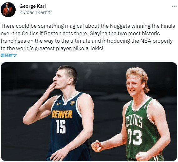 72岁名帅乔治-卡尔发推写道:如果凯尔特人晋级总决赛,掘金将击败绿军夺得总冠军,他们在夺冠的路上击败两支具有历史意义的球队(指湖人和凯尔特人两支17冠球队),约基奇将成为世界上最伟大的球员。