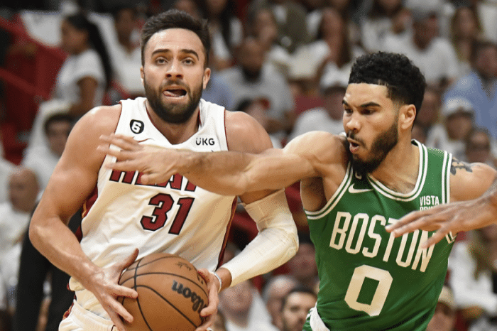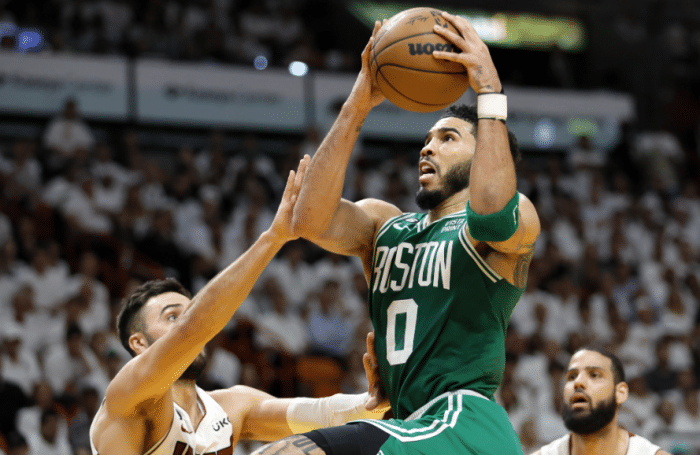 第二节,凯尔特人一直保持领先,布朗陷入犯规困扰,塔图姆扛起绿军进攻大旗,连续单挑强吃巴特勒,里突外投火力全开,单节独砍16分并且一度连得14分;当凯尔特人被热火打出9-1攻势时,也是塔图姆得分止血,半场13投7中轰下25分。