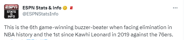 怀特东决G6压哨绝杀创纪录,这是NBA历史上淘汰赛第6次压哨绝杀,也是2019年小卡绝杀76人后第一位做到的球员。