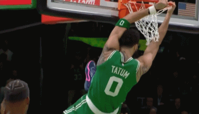 这是在第一节初期,热火的乐福抛投不中,塔图姆摘板之后推反击,他绕掩护走右侧加速,甩开防守球员之后直接双手暴扣,还有挂框的动作。落地之后的塔图姆朝着裁判甩手抱怨,结果是吃到技术犯规,巴特勒技术罚球命中。