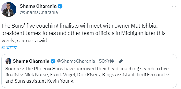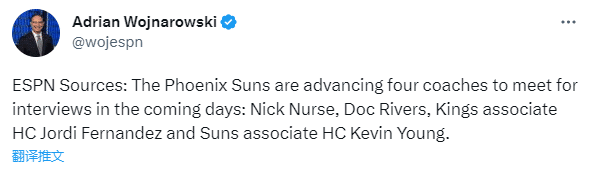 太阳新帅最终5人候选名单曝光,此前被76人解雇的里弗斯和被猛龙解雇的纳斯都是太阳新帅的有力争夺者,据shams报道,他们五人将在本周晚些时候和太阳老板伊什比亚、总裁詹姆斯-琼斯以及其他高管会面。