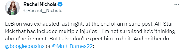 ESPN名记Rachel Nichols发推表示:昨晚詹姆斯筋疲力竭,全明星周末后疯狂带伤比赛,我不惊讶他考虑退役,但我预计他不会退役。