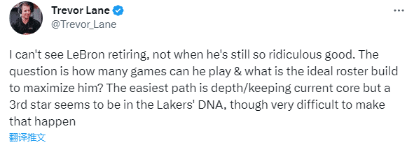 湖人记者Trevor Lane表示我不认为勒布朗会退役,尤其是在他还那么出色的时候。问题是他还能打多少场比赛?什么样的阵容才能最大限度地发挥他的作用?最简单的方法是深度和保持目前的核心,但湖人很难引援第三名球星。
