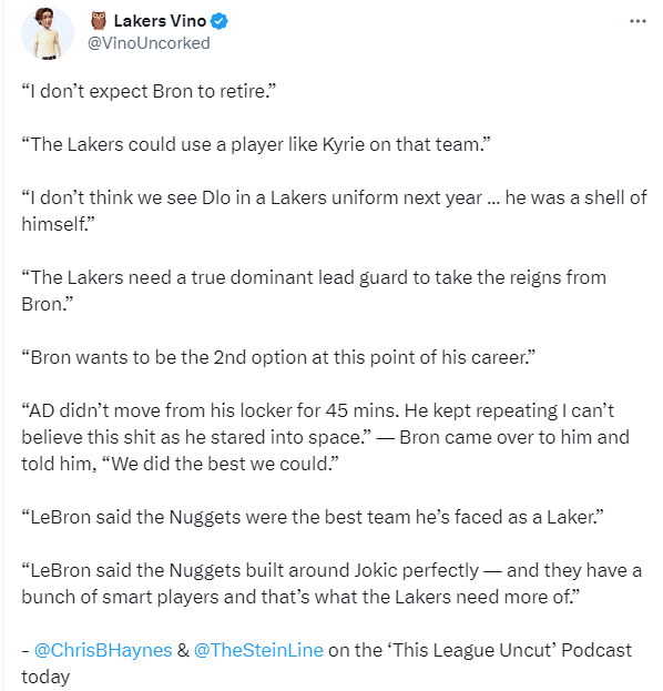 难道老詹真要退役吗?名记Chris Haynes和Marc Stein都在播客节目中表示预计詹姆斯不会退役;他们还表示詹姆斯希望在职业生涯这个阶段成为球队第二选择,预计拉塞尔下赛季不会再穿湖人球衣了。