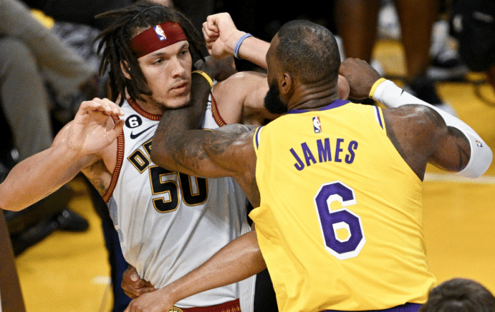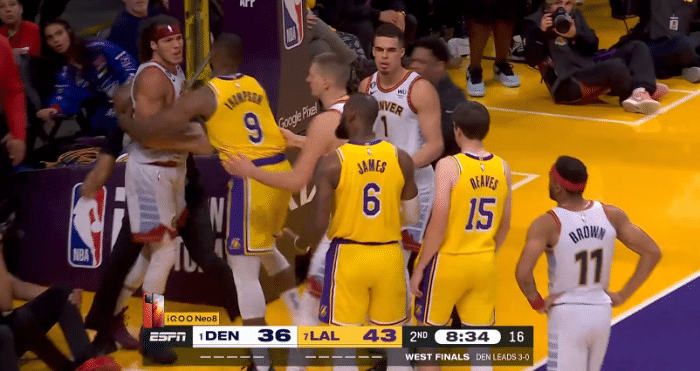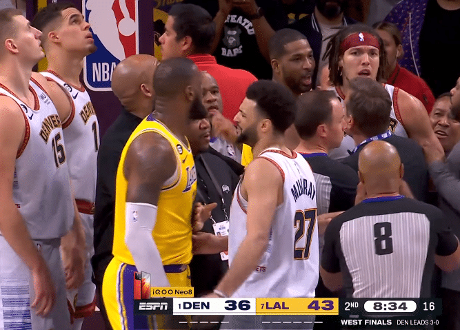 第二节8分34秒,戈登防守时打到詹姆斯的下巴,两人卡位发生肢体接触相互推搡,詹姆斯十分生气,把手臂架在戈登的脖子上并且推开对手,双方激烈互喷,TT第一时间冲上去拦住戈登;裁判回放之后,吹罚双方技术犯规。