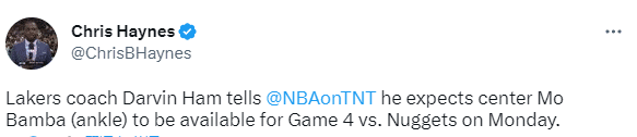 由于遭遇左脚踝扭伤,班巴因伤连续缺席了9场比赛,哈姆透露班巴预计将在西决G4复出,对于湖人来说,这算是一个好消息,湖人可以多一个防守约基奇的选择。