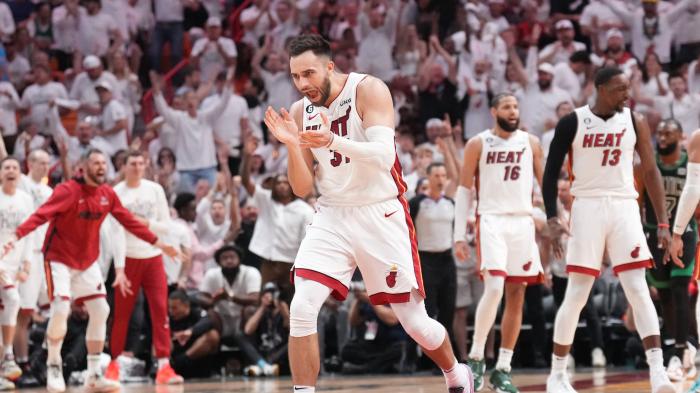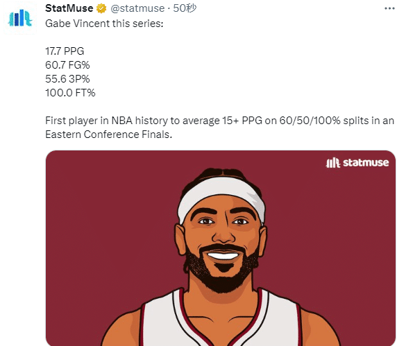 5、文森特东决场均17.7分,投篮命中率60.7%、三分命中率55.6%和罚球命中率100%,成为NBA历史第一位在东决系列赛场均15+且三项命中率60%、50%和100%的球员