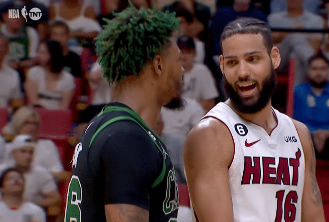 巴特勒多次疯狂庆祝抢镜,上半场热火领先两位数时,巴特勒露出邪魅笑容,这得意的笑容瞬间刷屏;下半场,热火一波攻势再次领先到20分以上时,巴特勒模仿霍福德,为绿军喊暂停太搞笑。