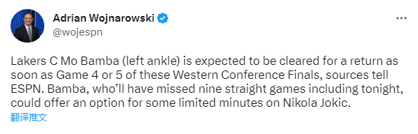 另外据报道,因伤(左脚踝扭伤)连续缺席9场比赛的湖人中锋班巴有望在西决G4或者G5比赛中复出,湖人可以多一个防守约基奇的选择;对于湖人来说,这算是一个好消息。