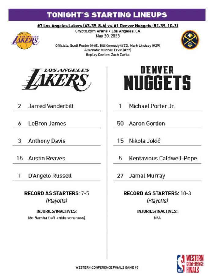 178直播讯05月21日,湖人和掘金西决G3首发阵容出炉,湖人首发五虎是詹姆斯、浓眉、里夫斯、拉塞尔和范德彪,目标获胜拒绝0-3落后,这套首发季后赛7胜5负;另外湖人迎来利好消息,湖人中锋班巴最快西决G4复出;掘金延续原有首发,约基奇、穆雷、小波特、戈登和波普继续搭档首发。