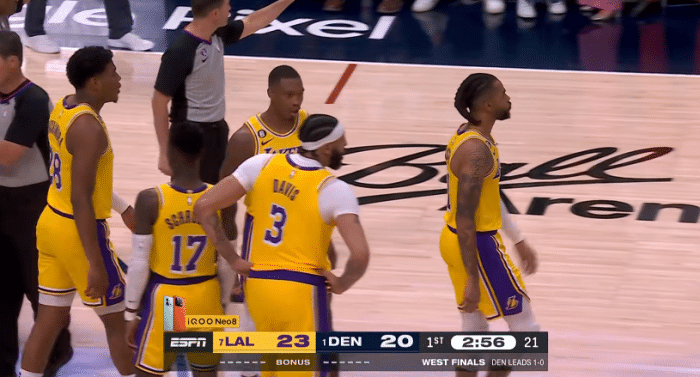 178直播05月19日讯 ,湖人和掘金西决G2正式开打,裁判吹罚引争议,第一节场上发生恶犯事件,拉塞尔恶犯放倒穆雷,詹姆斯摊手抱怨十分不满。