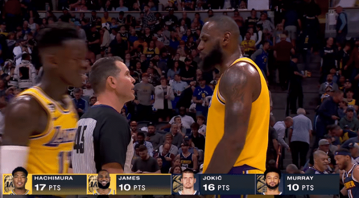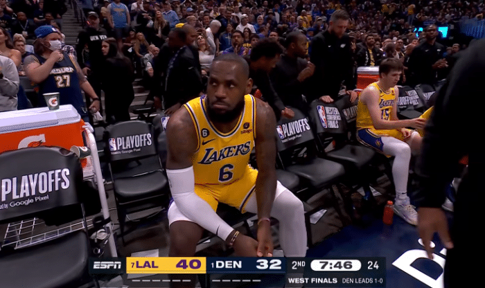 詹姆斯下场休息后掘金反扑追分,5分07秒詹姆斯重新上场,中投和三分都打铁,掘金继续缩小分差,湖人将近6分钟没有运动战进球,1分36秒詹姆斯突破上篮打破僵局,之后老詹助攻八村扣篮,半场打完湖人53-48领先5分。