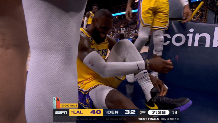 暂停回来,詹姆斯持球突破期间踩到穆雷的脚,脚踝崴了一下,表情痛苦,坐在地板上绑紧鞋带继续留在场上,即使38岁了,老詹仍旧是轻伤不下火线。