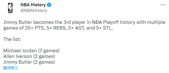1、巴特勒生涯第2次在季后赛砍下至少30分5篮板5助攻5抢断,为NBA历史上第五位季后赛多次达成这一数据的球员,另外四位分别是乔丹(8次)、艾弗森(3次)、威少(3次)、里克-巴里(2次)