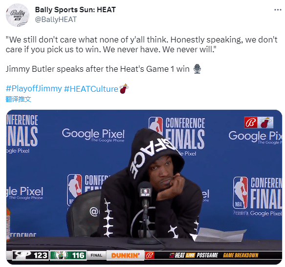 热火东决1-0领先凯尔特人,不过热火夺得东部冠军的概率仍只有44%,仍旧不被看好,赛后谈到被外界看衰以及想过能走到现在吗?巴特勒霸气回应:该死的,我做到了,我们做到了,最好的部分是我们仍然不在乎你们所有人的想法,我们不在乎你们是否选我们能赢。