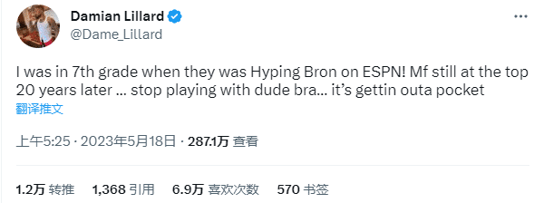 不久前,利拉德发推写道:我上七年级的时候,人们就在ESPN上吹捧勒布朗了!(MD)20年过去了,他仍然是最顶级的。停止对他的不尊重,因为这样是不对的,有些内容太过分了。