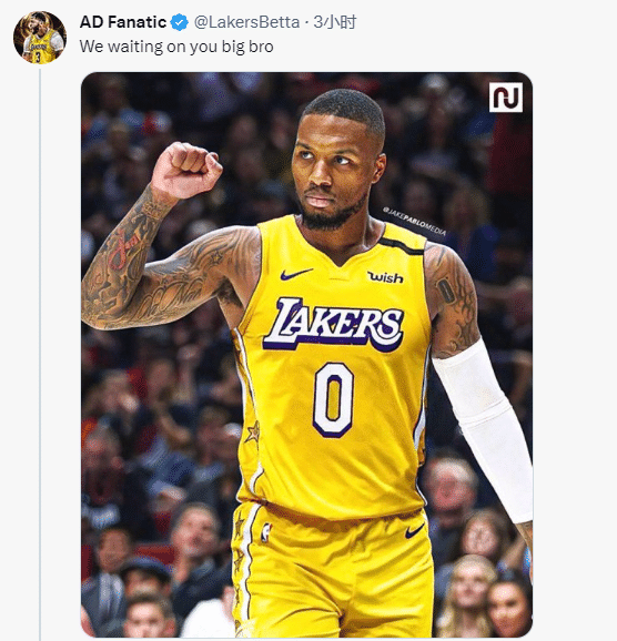 利拉德谈及詹姆斯的推文引热议,短短3个小时获得280多万的浏览,超过一万人转发,湖人球迷在评论区招募利拉德,晒利拉德身穿湖人球衣的P照,配文写道:我们想要你,兄弟。