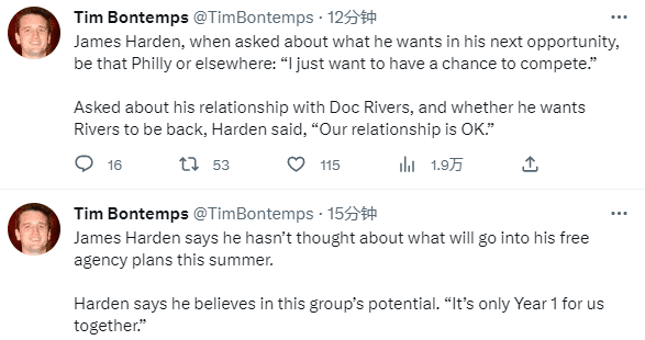 在赛后接受采访时,哈登在谈到今夏将成自由球员时这样说道:这个我还没有考虑过,我相信这支球队的潜力,我们人员齐整在一起打球才仅仅一年。