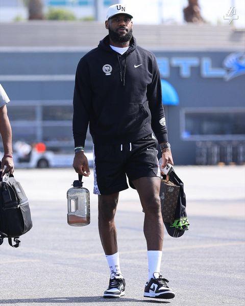 38岁的詹姆斯提着吨吨桶大水壶,提着宝宝拿着手机,身穿短裤和黑色连帽卫衣,戴着棒球帽,眼神专注;老詹率队出征西决挑战掘金,在本轮系列赛中,詹姆斯只要再拿88分就能解锁季后赛8000分新成就,历史独一档。