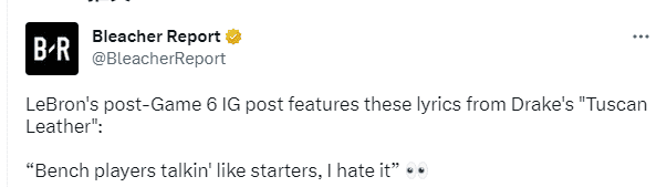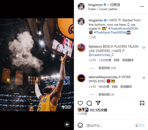 湖人晋级西决的第二天,詹姆斯更新Ins,晒出对阵勇士的赛前和赛场照,配文写道:我讨厌它!从底层开始,现在我们在这儿,我们做到了!(6号王冠表情);在图集的背景音乐中,詹姆斯用的是德雷克的歌曲《Tuscan Leather》,歌词内容是“替补球员就像首发一样说话,我讨厌它!”