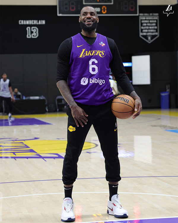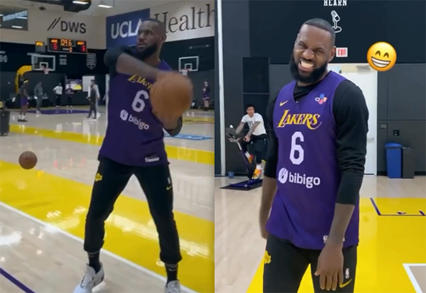 与往常一样,詹姆斯身穿湖人6号球衣进行训练,开心之情溢于言表——老詹命中超远三分后故意闯进镜头中,还用怪异的投篮动作命中三分,手感不错咬牙咧嘴庆祝。