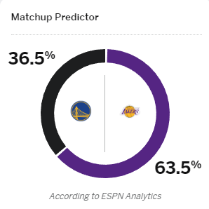 本赛季湖人和勇士已经交手过两次,两队各胜一场;本赛季第三次交手,ESPN预测湖人赢球概率为63.5%,勇士获胜概率为36.5%。
