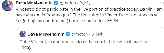 据湖人记者Dave McMenamin报道,文森特身穿湖人队服出现在球场边,不过他没有参加实战训练;消息源透露,文森特回归过程的最后一步将是恢复他的体能。