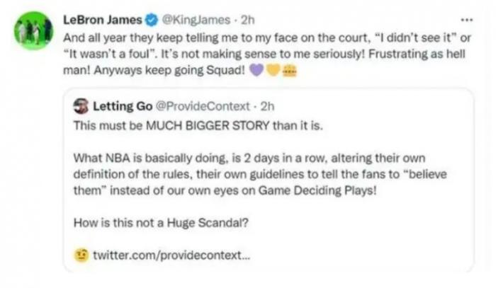 詹姆斯当时发推写道:整整一年,他们一直在球场上当着我的面跟我说,‘我没看到’或‘这不是犯规’。对于我来说,这没有任何的意义!这真的是令人沮丧,但是无论如何,球队会继续前进。