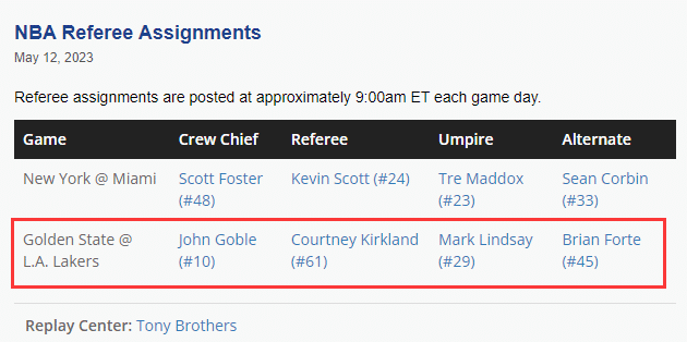 NBA官方赛前公布湖人和勇士G6裁判组:约翰-戈贝尔(10号)、库尔特尼-柯克兰(61号)、马克-林赛(29号)。值得一提的是,约翰-戈贝尔曾吹罚首轮湖人对阵灰熊G4,虽然湖人最终取胜,但詹姆斯赛后罕见地发推表达了对于吹罚的不满。