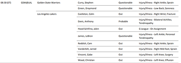 浓眉(双侧跟腱炎)大概率出战;詹姆斯(左脚踝腓侧肌腱炎)出战成疑;雷迪什(右脚踝扭伤)、卡斯尔顿(右手腕骨折)、范德比尔特(右中足扭伤)、伍德(左膝积液)、文森特(左膝手术)缺席比赛;希菲诺在南湾湖人队也将缺席。