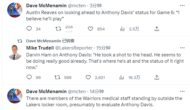 据名记Dave McMenamin报道,湖人更衣室外有数名勇士医务人员在等候,估计是要对安东尼-戴维斯进行评估。