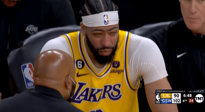湖人和勇士G5末节6分多钟,浓眉在比赛中被卢尼肘击到太阳穴,之后浓眉捂着头部十分痛苦,无法参与防守,坐回替补席仍明显眩晕,换了一段时间后,浓眉缓慢离场,直接返回更衣室。