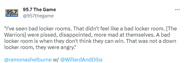 名记Ramona Shelburne透露勇士G4输球后更衣室情况,表示:我从业多年,见过气氛糟糕的更衣室,那(昨日赛后的勇士)给我的感觉不像是个糟糕的更衣室。他们(勇士)都很生气、很失望,但更多是生自己的气。当一支球队认为自己赢不了的时候,更衣室就会变得糟糕。但显然勇士更衣室在昨日赛后并不平静,他们都很生气。