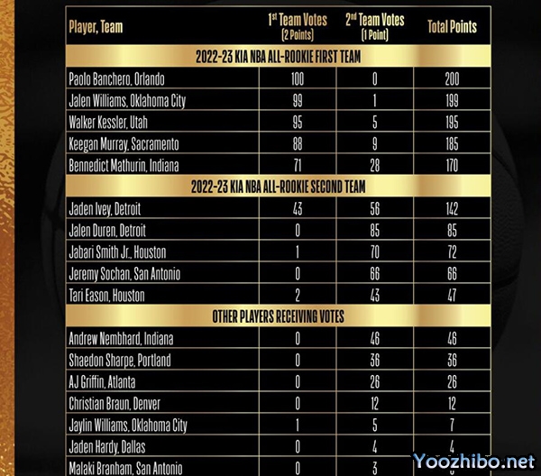 官方公布了新秀最佳一阵具体的得票情况,具体如下: