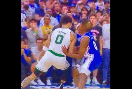 如果说这一对比还不够明显,那么塔图姆的这个动作,就实在让人不理解。塔图姆最后时刻命中关键三分球,但进球前,他推了一把马克西。裁判报告解释,塔图姆和马克西二人共同移动,塔图姆突破时试图摆脱接触,此处没有犯规。这一动作毫无疑问令人想到湖人勇士G3中,汤普森对于范德比尔特的犯规。塔图姆此处都已经直臂,而汤普森还是曲臂,显然塔图姆发力更狠。