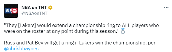 178直播05月09日,据名记Chris Haynes报道,湖人总经理佩林卡已经确认,若湖人本赛季夺冠,他们将为本赛季在任何时刻效力过球队的球员颁发总冠军戒指,这意味着若湖人夺冠,威少和贝弗利等湖人旧将都能收到湖人的总冠军戒指。