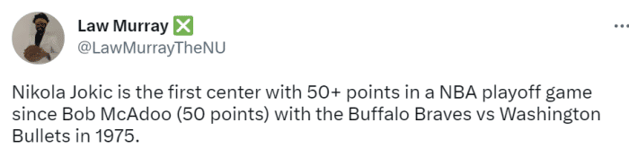 数据显示,他是1975年的麦卡杜(50分)之后,第一位在季后赛至少得到50分的中锋。季后赛历史上得分超过50分的中锋,只有张伯伦和约基奇。约基奇也加入巴特勒(56分)、库里(50分),成为今年季后赛第三位单场砍下50+的球员。
