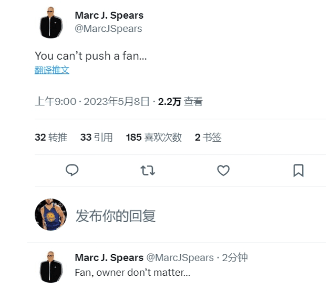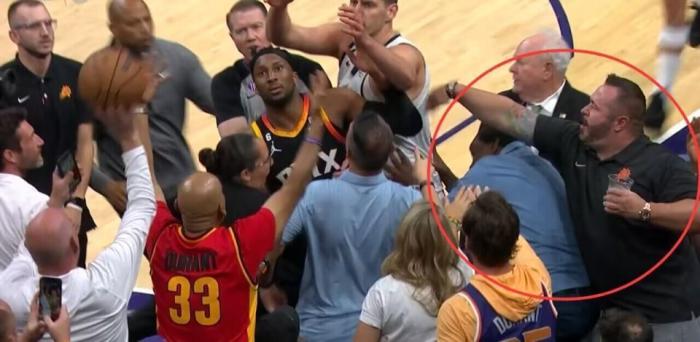 半场结束前2分36秒,比赛还出现了火爆一幕。约基奇急于发球,想从太阳新老板Ishbia手里抢球,还一肘子推倒了老板。裁判回放后,给了约基奇一次技术犯规。趁着混乱推约基奇的太阳球迷被驱逐出场。不少记者更新社媒调侃,约基奇不能推倒球迷,老板没关系。还有记者表示,这可能是NBA老板的第一次假摔。从慢镜头来看,Ishbia的反应确实有点夸张了。