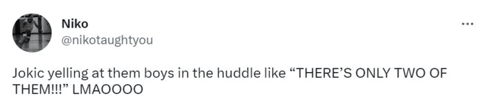 第三节,约基奇和布克开启了对飙模式。约基奇在这一节10中6,单节轰下18分,而布克这一节6中6得到17分。三节打完,约基奇已经42分12篮板6助攻,布克也得到36分。美媒晒出了约基奇在场边激动训话的一幕,有球迷表示,约基奇就像是在冲着队友们抱怨:“对方就只有两个人啊!”