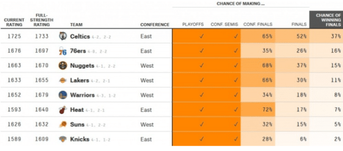 那么说太阳赢下G4,大比分扳平之后的晋级概率是多少呢?大数据机构FiveThirtyEight模型预测,太阳晋级概率升至32%,相比起之前有明显提升。掘金晋级西决的概率降至68%,虽然连输两场,但联想到接下来他们依旧有主场优势,所以约基奇率领的掘金依旧是被看好的一方。