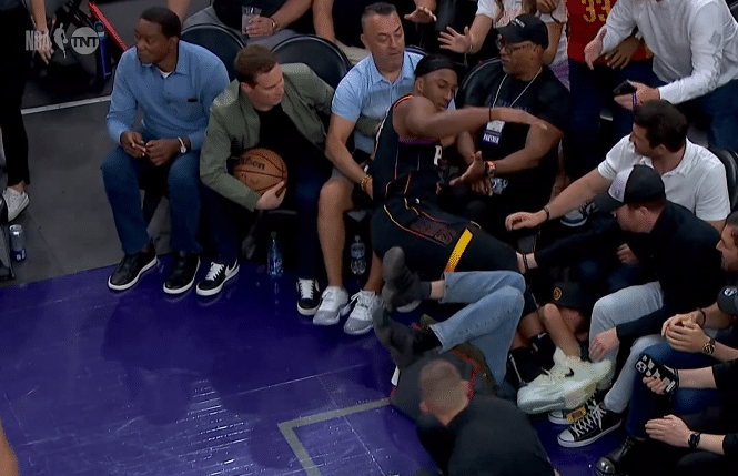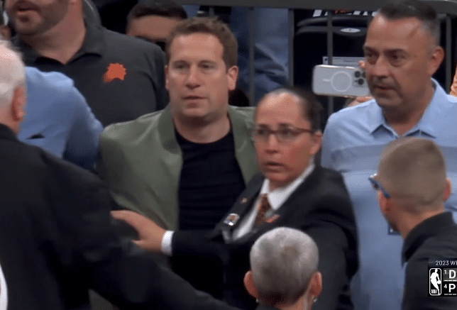 178直播05月08日,NBA季后赛掘金和太阳系列赛G4正式开打,第二节场边发生不和谐一幕,约基奇抢球推搡太阳老板吃到技犯,场边球迷与约基奇争吵,现场一名球迷被驱逐离场。