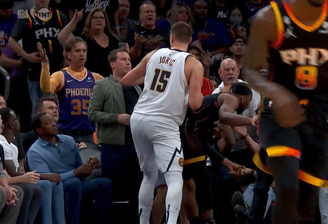 第二节2分36秒,奥科吉为救球摔进观众席,太阳老板坐在场边并且抱着篮球去扶奥科吉,约基奇冲过去,想要快速发球发动快攻,从太阳老板怀里争夺篮球,期间他推搡了太阳老板一把,后者直接坐在椅子上,裁判多次回放这一幕,最终吹罚约基奇技术犯规。