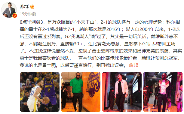 苏群晒出詹姆斯、库里、格林的G3入场照,解释G2说湖人演过了是开玩笑,并且认错直言这样说的不妥的,苏群还表示自己最喜欢勇士并且预测勇士总冠军。